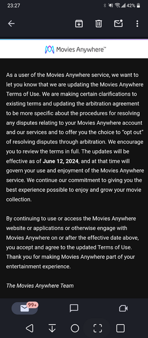 [edit | edit source]Movies Anywhere notified users[when?] of an opt-out change in their Terms of Service (TOS). As per the email, the user is already opted into a new updated agreement and will be under those conditions effective as of June 12, 2024.