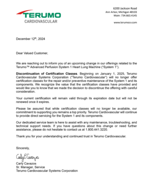 On December 12, 2024, Terumo Cardiovascular informed customers that, effective January 1, 2025, it would no longer be offering certification for repair or maintenance of the System 1, its advanced perfusion heart-lung machine. Instead, future repair and servicing is expected to be carried out by the company directly. While existing certifications will remain valid, they will naturally lapse at their expiration dates, and renewal will not be possible.
